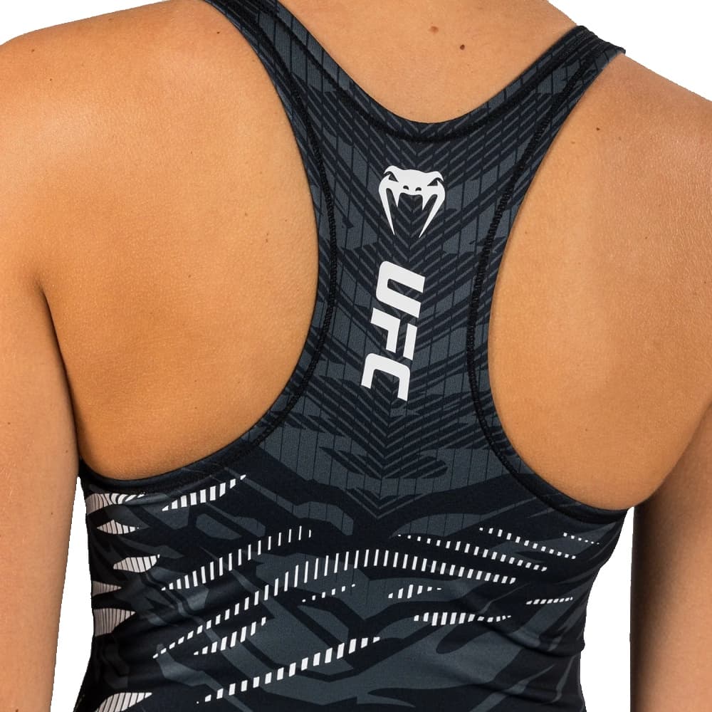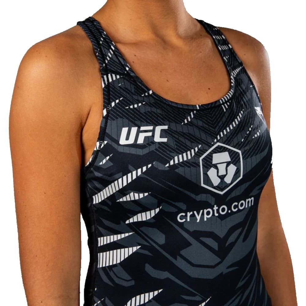 La camiseta ajustada UFC Fusion by Venum Authentic Fight Night para mujer con sujetador es ideal para cardio, levantamiento de pesas y sparring. La banda elástica ofrece soporte, mientras que el corte de espalda cruzada garantiza libertad de movimiento.