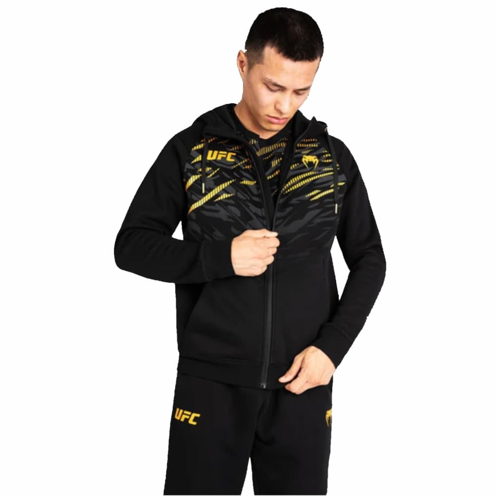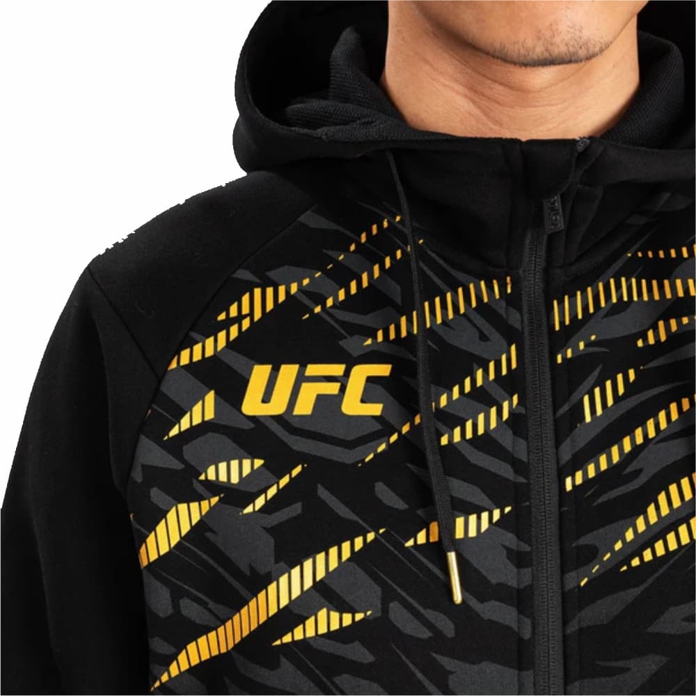 Inspirada en los atuendos que usan los atletas de UFC, la colección UFC Fusion by Venum Replica es ideal tanto para fanáticos como para luchadores. El estampado animal dinámico utilizado en toda la colección invita a los atletas a conectarse con su instinto primario más profundo para prevalecer. La sudadera con capucha UFC Fusion by Venum Replica para hombre presenta un bolsillo frontal estilo canguro y una capucha con cordón. Los detalles del logotipo de Venum y UFC se encuentran en el pecho y la capucha. Esta combinación de colores negro/dorado está reservada para los campeones de UFC. Disponible en dos colores, combina perfectamente con los demás productos de la misma colección.