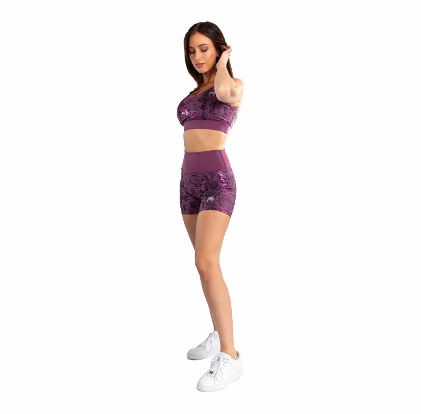 Bienvenidos a la jungla urbana. Venum Amazonia, una colección para deportes de combate y fitness, es tan glamurosa como salvaje. Transpirables y absorbentes del sudor, los pantalones cortos de compresión para mujer Venum Amazonia te permitirán moverte con libertad y comodidad. No importa cuán intenso sea el entrenamiento, la cintura elástica y la tela compresiva de “segunda piel” se mantendrán en su lugar. La combinación de colores púrpura con detalles metálicos realza un estampado clásico de piel de serpiente para un conjunto exclusivo de Venum.