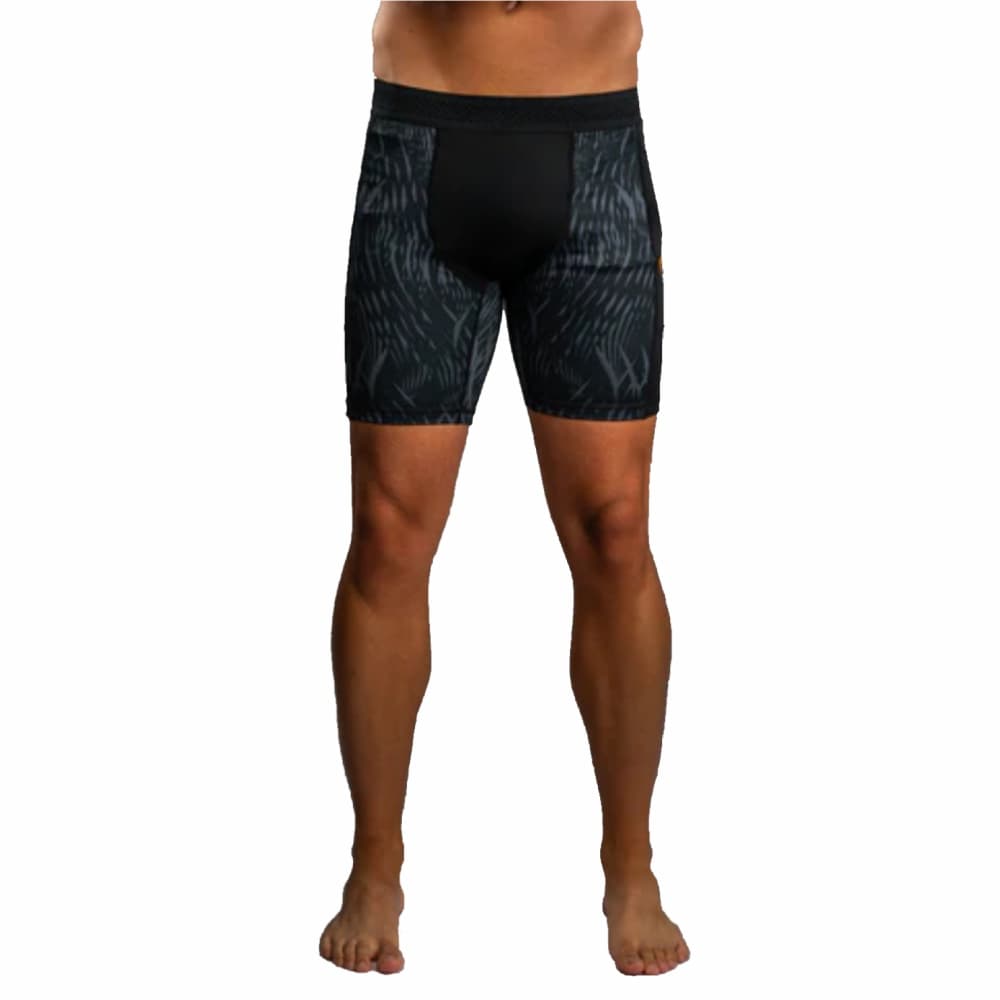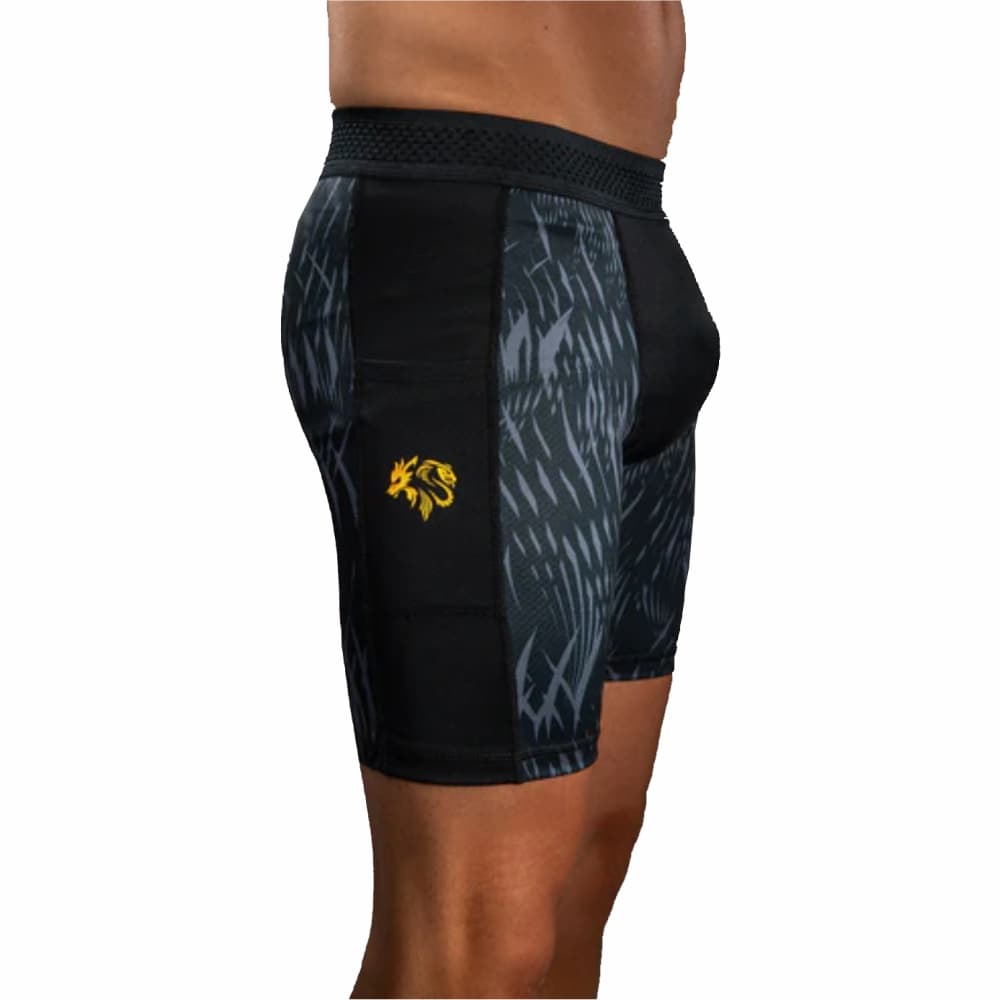 El diseño de este pantalón corto presenta elegantes gráficos sublimados en negro y gris que evocan el pelaje del lobo. Los toques dorados de la marca conjunta resaltan la fuerza de esta colaboración de MMA.