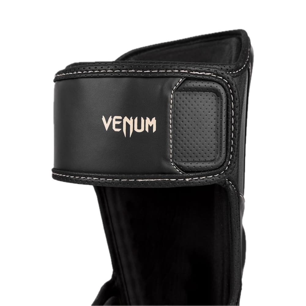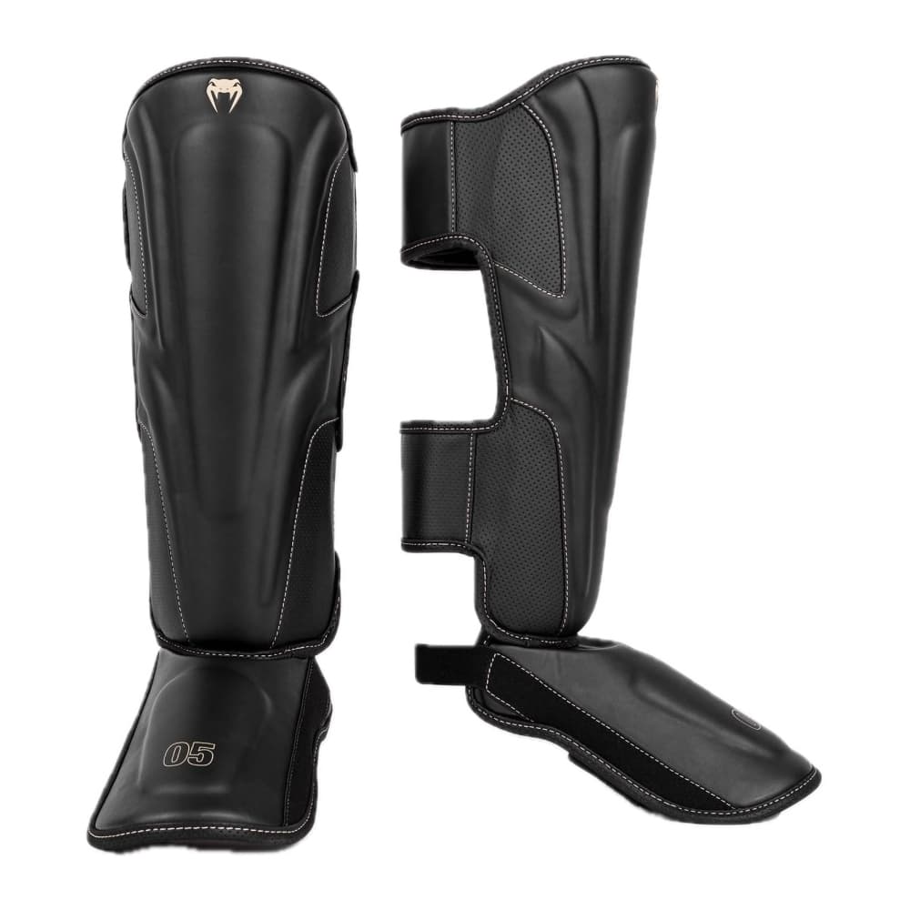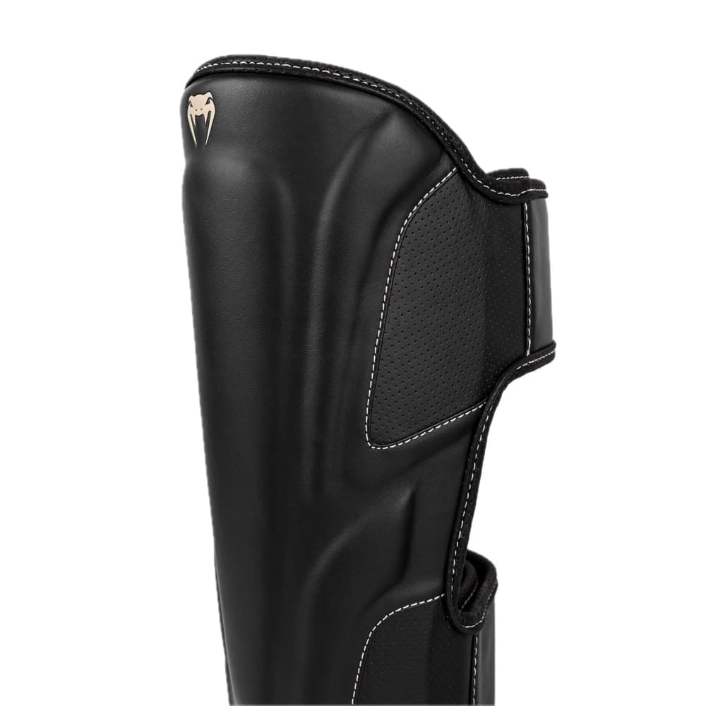 Estas llamativas espinilleras negras cuentan con costuras beige a lo largo de las líneas de su construcción anatómica para un sutil efecto de contraste. Los pequeños logotipos beige mantienen el diseño discreto pero impactante.