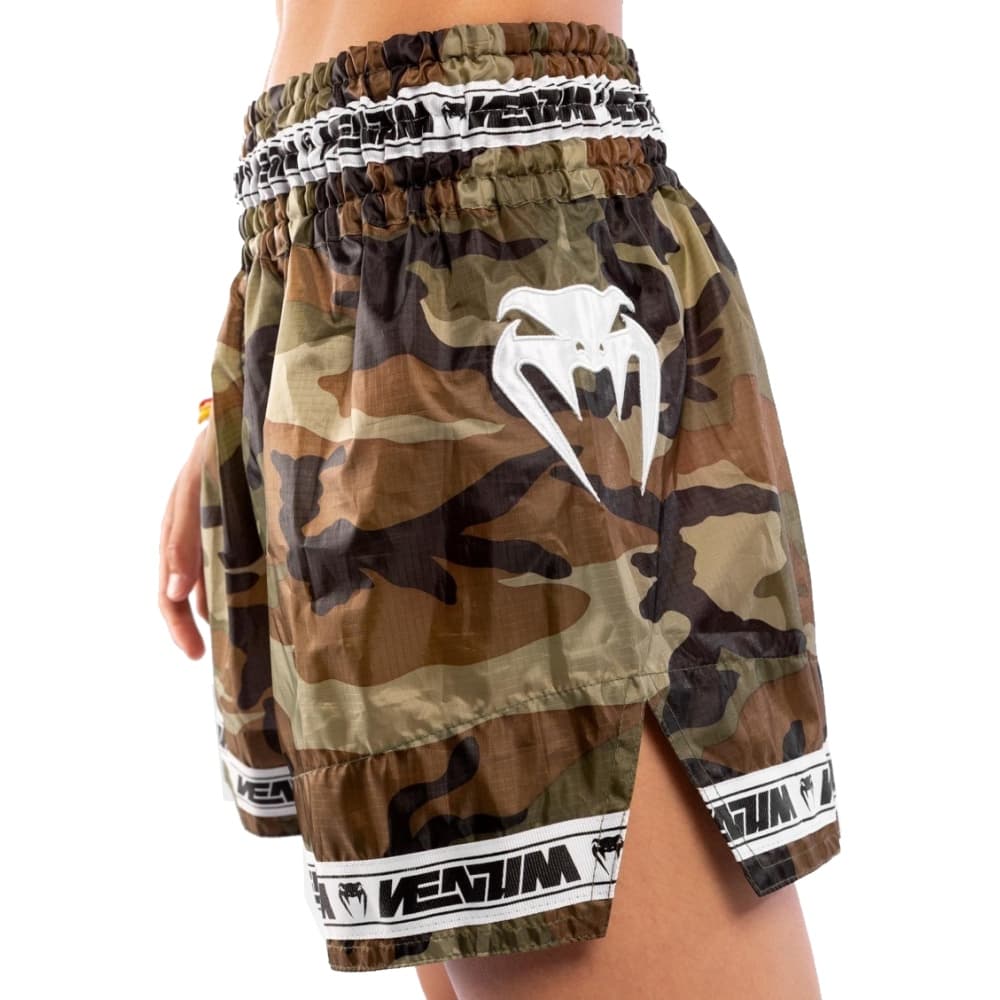 Una pretina elástica ancha tradicional, con un gran logotipo de Venum bordado, garantiza un soporte óptimo alrededor de la cintura durante el combate.