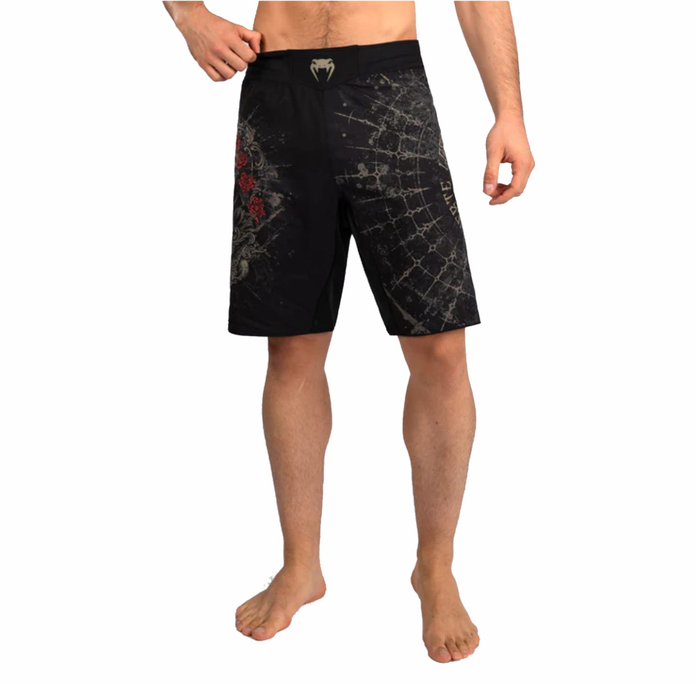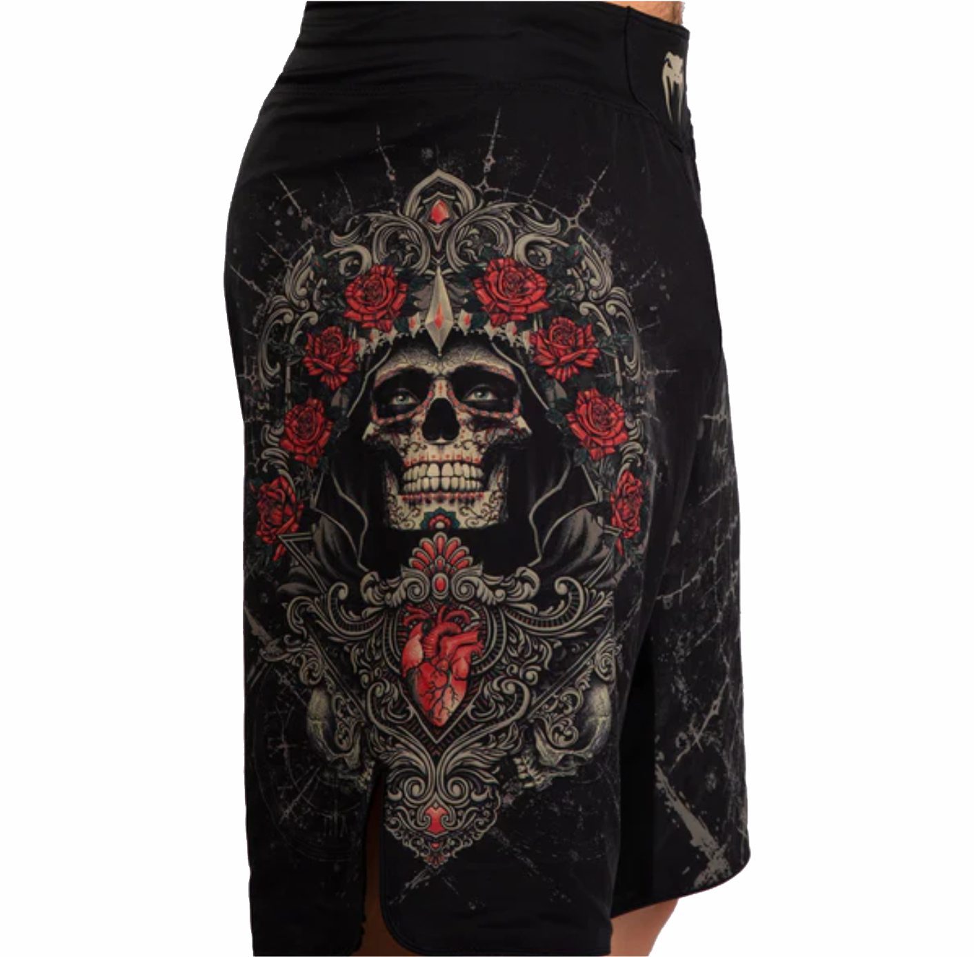 Presentamos Venum Santa Muerte, una colección estilizada de equipo de combate y ropa de alto rendimiento, dedicada a la amada “Santa de la Muerte” de México. Los pantalones cortos de combate Venum Santa 5.0 para hombre son unos pantalones cortos ligeros hechos para soportar un entrenamiento intenso. Ideales para MMA, Jiu-Jitsu y otros deportes de combate, la tela flexible y las aberturas laterales te permiten moverte libremente. Mientras tanto, el cierre seguro de velcro en la cintura te permite concentrarte en tu rendimiento. El llamativo diseño en negro y dorado de estos pantalones presenta gráficos góticos ornamentados dedicados a La Santa Muerte.
