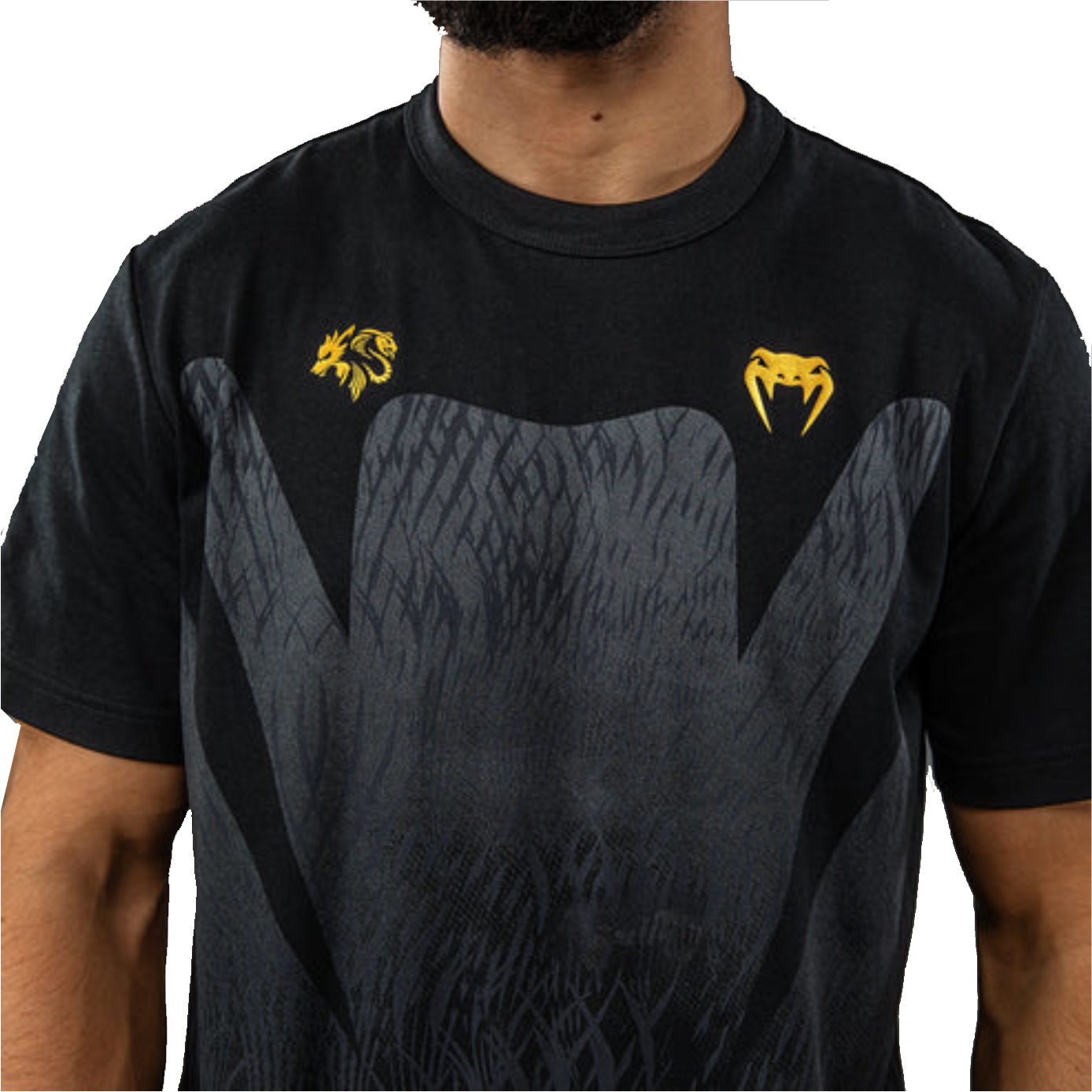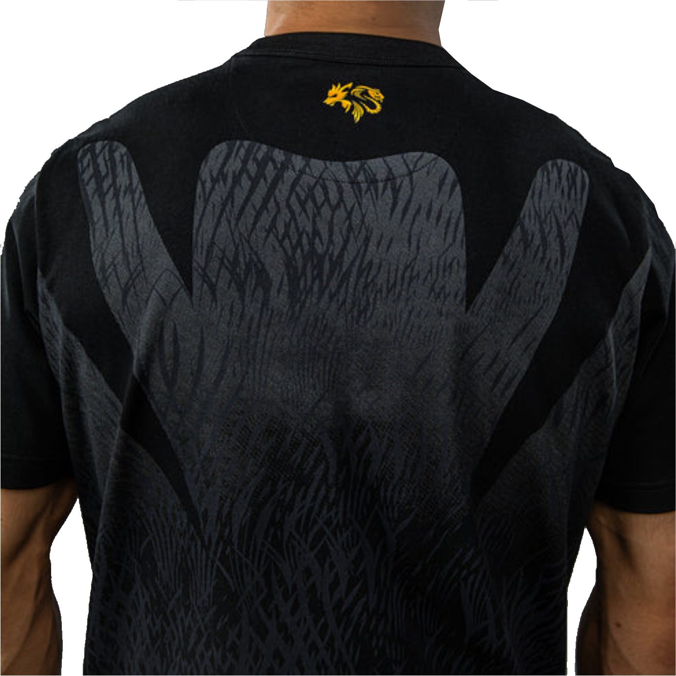 El diseño de esta camiseta presenta elegantes gráficos sublimados en negro y gris que evocan el pelaje del lobo. Los toques dorados de la marca conjunta demuestran la fuerza de esta colaboración de MMA.